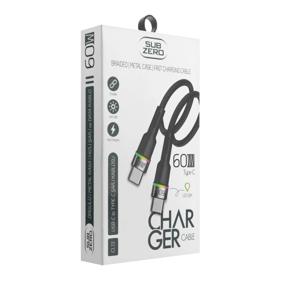 كابل Subzero CL13 بقدرة 60 واط من Type-C إلى Type-C، مضفر ومضيء للشحن السريع، بتصميم قوي وأنيق.