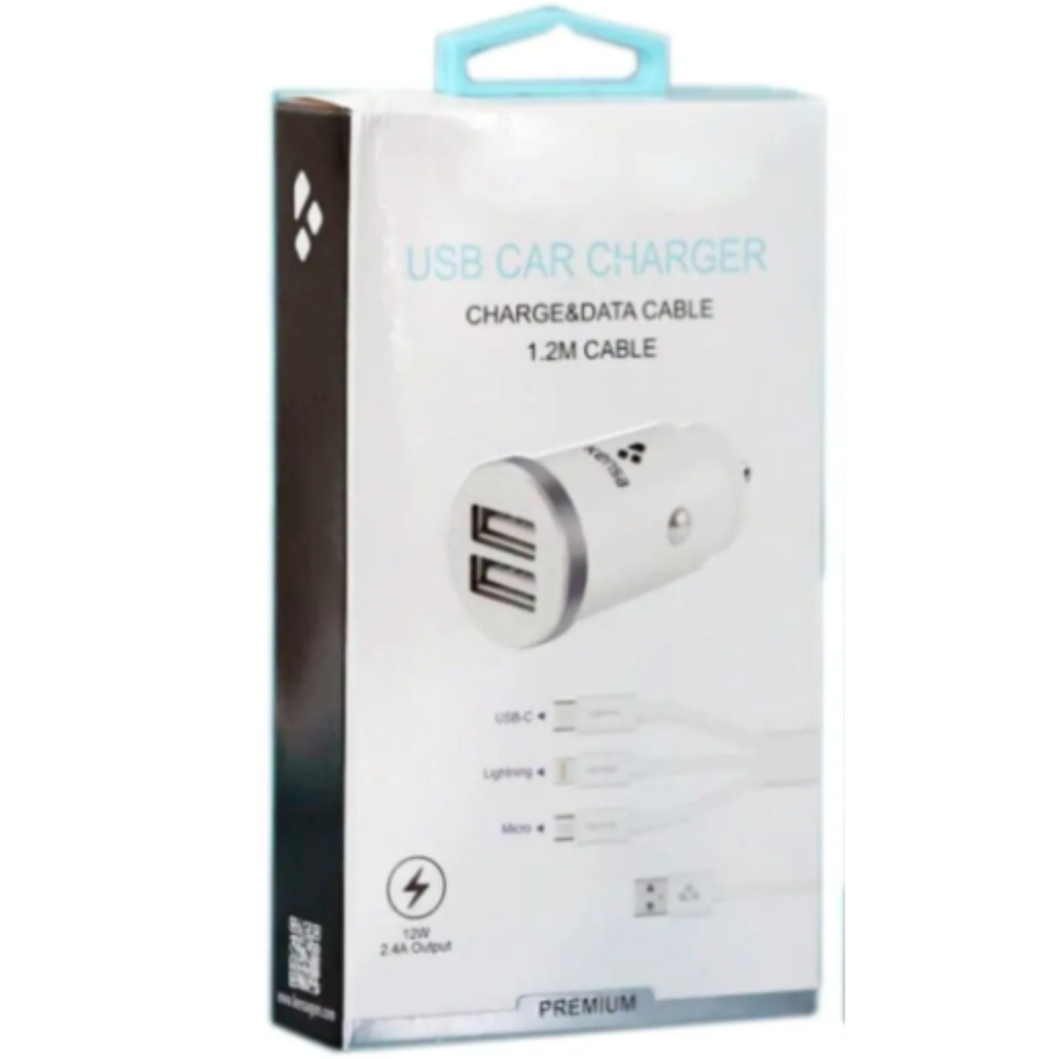 عربي: شاحن سيارة Kensa CR-82 بطول 1.2 متر، بقدرة 12 واط و2.4A، مع منافذ متعددة (Type-C / Lightning / Micro USB) لشحن سريع ومتعدد الاستخدامات.