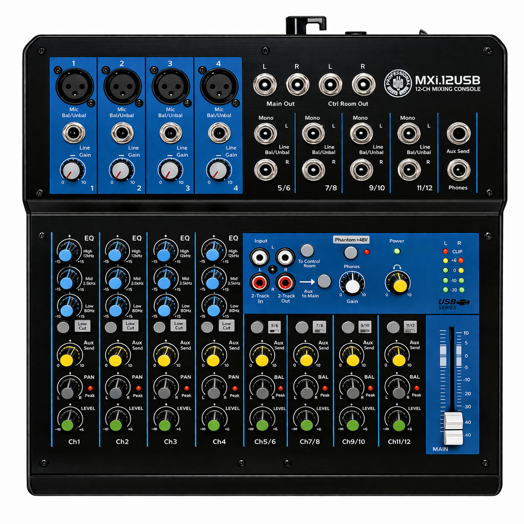 MXİ.12 USB – 12-Channel, 2-Bus, DSP (16 Presets), USB Recording Port, 48V Phantom Mixer
