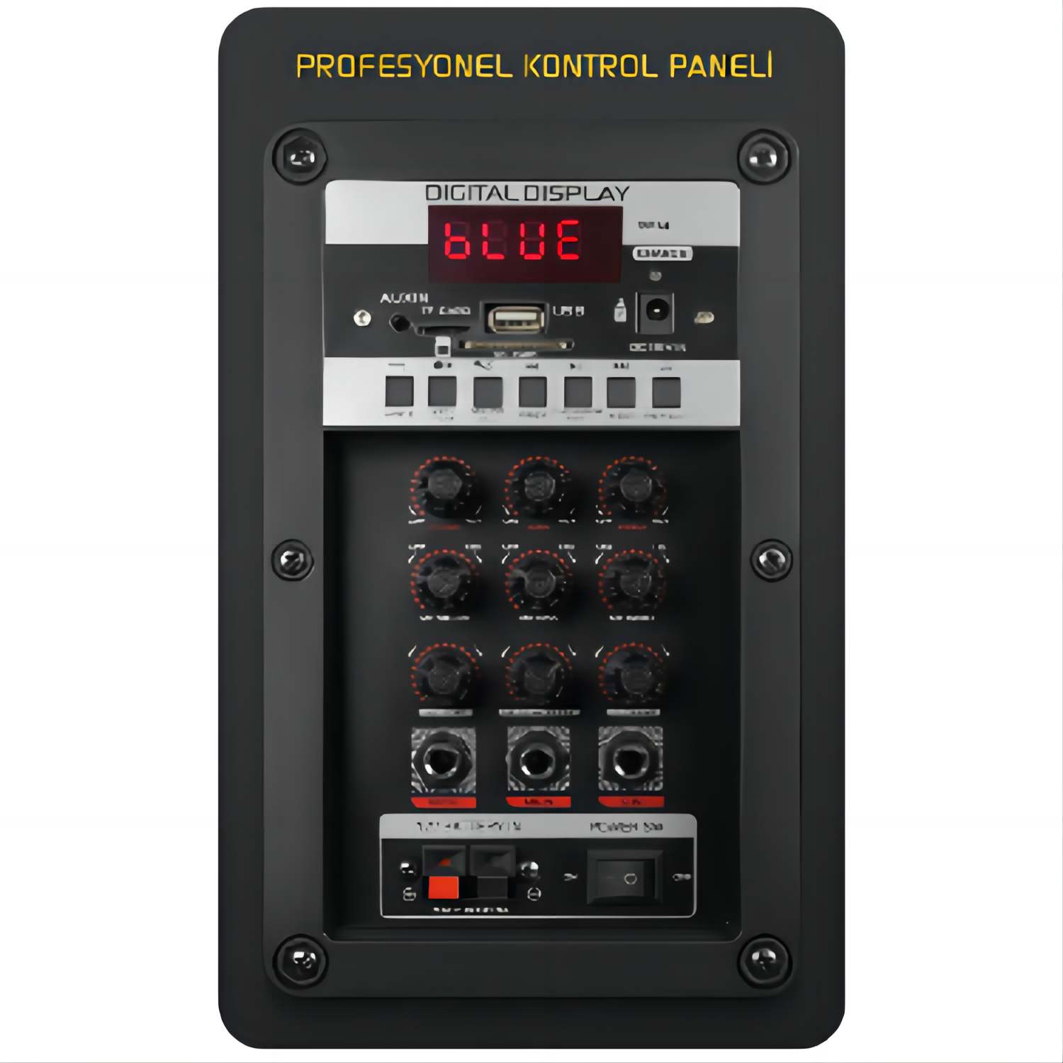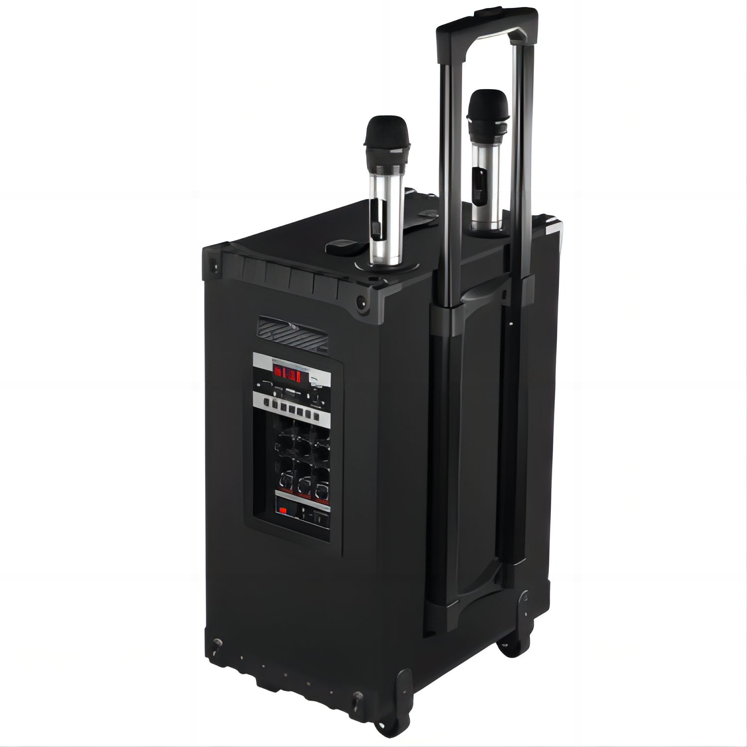 سماعة Mayestro MT90 محمولة بقياس 15 بوصة مع منافذ USB وSD وتقنية بلوتوث، مزودة بجهاز تحكم عن بعد وميكروفونات للاستخدام المتنوع في الفعاليات والعروض التقديمية.