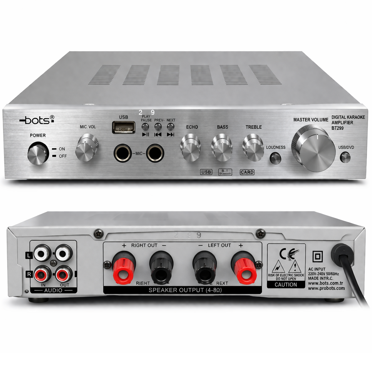 Bots BT-299 2×60W power, stereo amp, USB input, 12V, echo control Stereo Amplifier