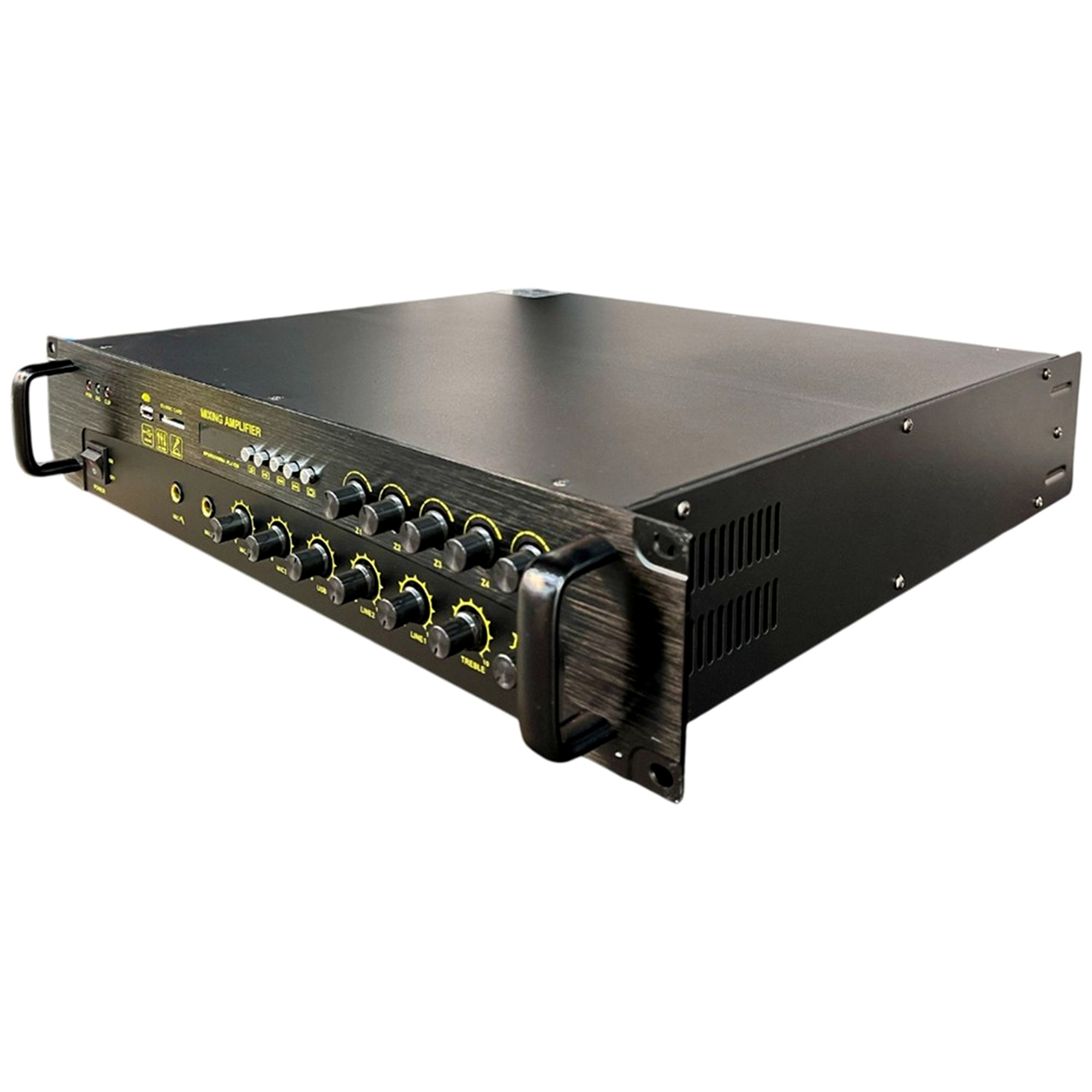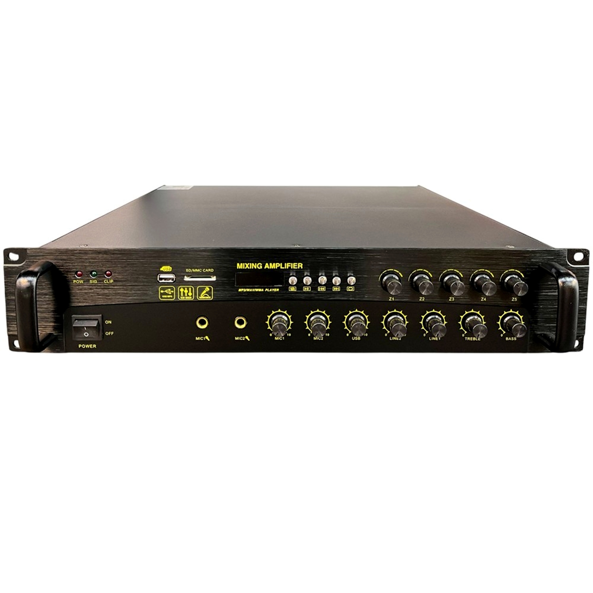 يُعد Bofmann BF-155T مضخم ميكسر احترافي بقدرة 150 واط يدعم 5 مناطق صوتية بنظام خط 100 فولت، ومصمم لأنظمة النداء العام والاستخدامات التجارية. يتيح التحكم المستقل بكل منطقة، كما يدعم Bluetooth وتشغيل MP3، ويحتوي على مدخلين للميكروفون مع خاصية أولوية الصوت (Mute)، مما يجعله مناسبًا للمساجد والمدارس والمتاجر. ⚙️ المواصفات قدرة 150 واط دعم 5 مناطق صوتية نظام خط 100 / 70 فولت Bluetooth وتشغيل MP3 مدخلين ميكروفون (أولوية) مدخل ومخرج AUX تحكم في Bass وTreble تحكم مستقل بمستوى الصوت لكل منطقة