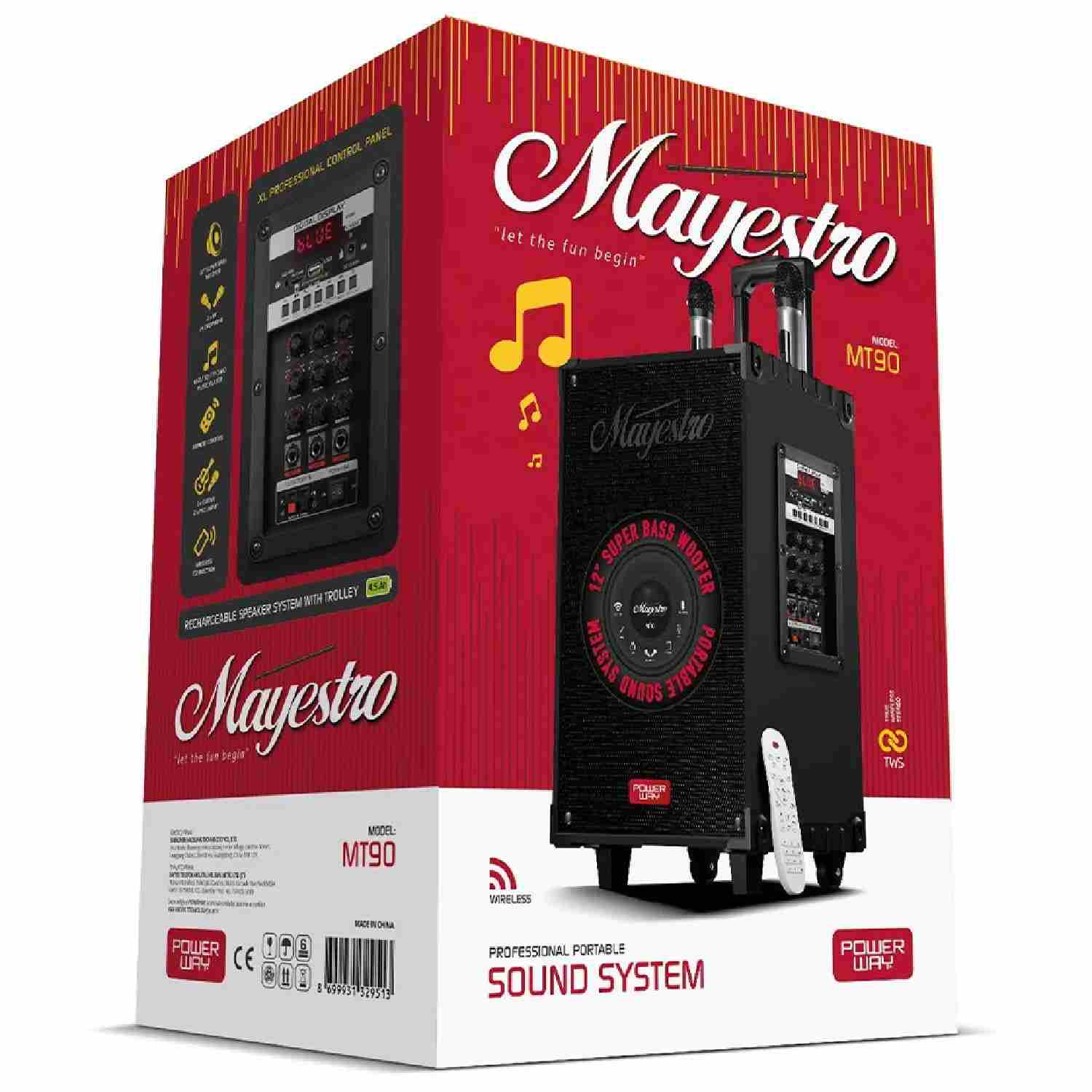 سماعة Mayestro MT90 محمولة بقياس 15 بوصة مع منافذ USB وSD وتقنية بلوتوث، مزودة بجهاز تحكم عن بعد وميكروفونات للاستخدام المتنوع في الفعاليات والعروض التقديمية.