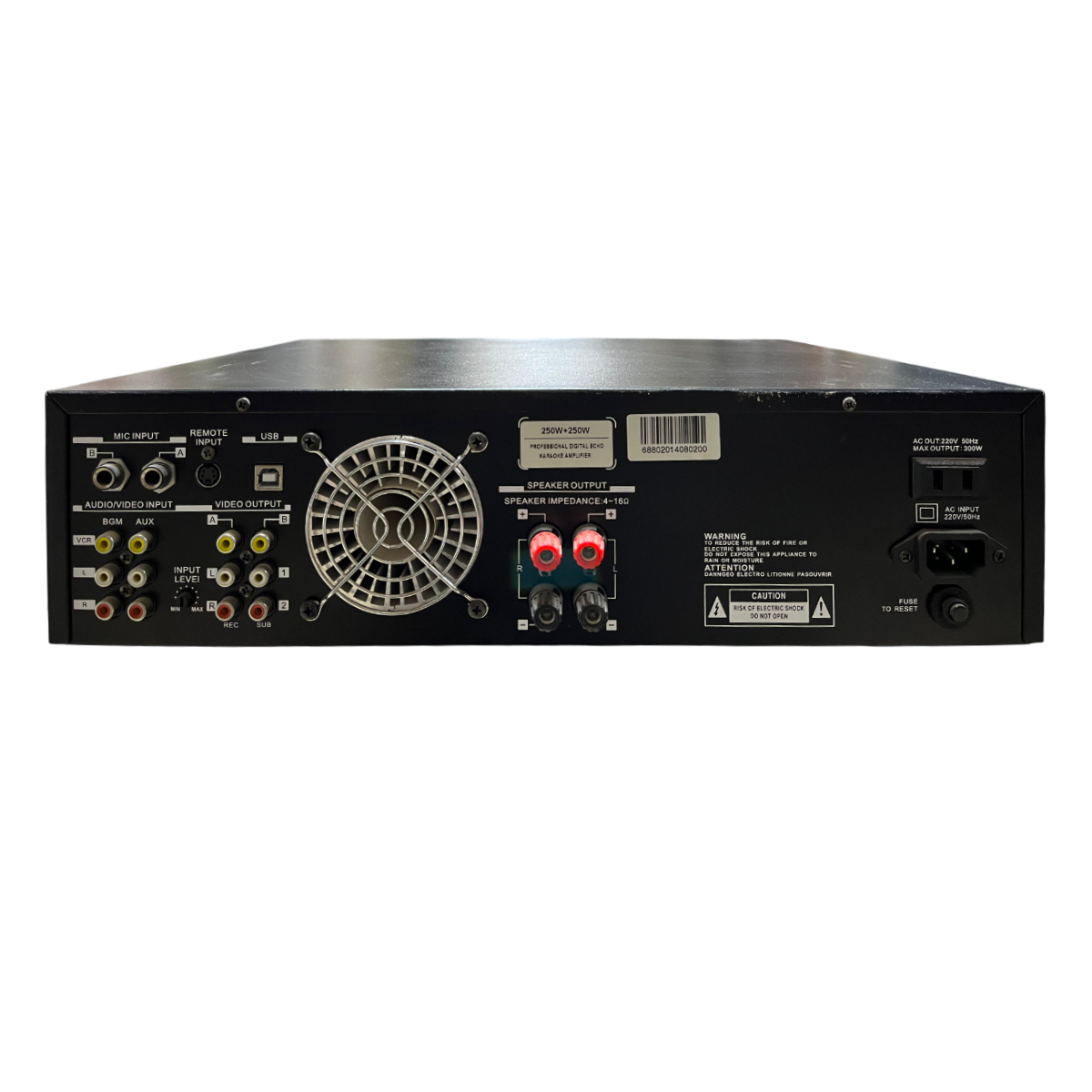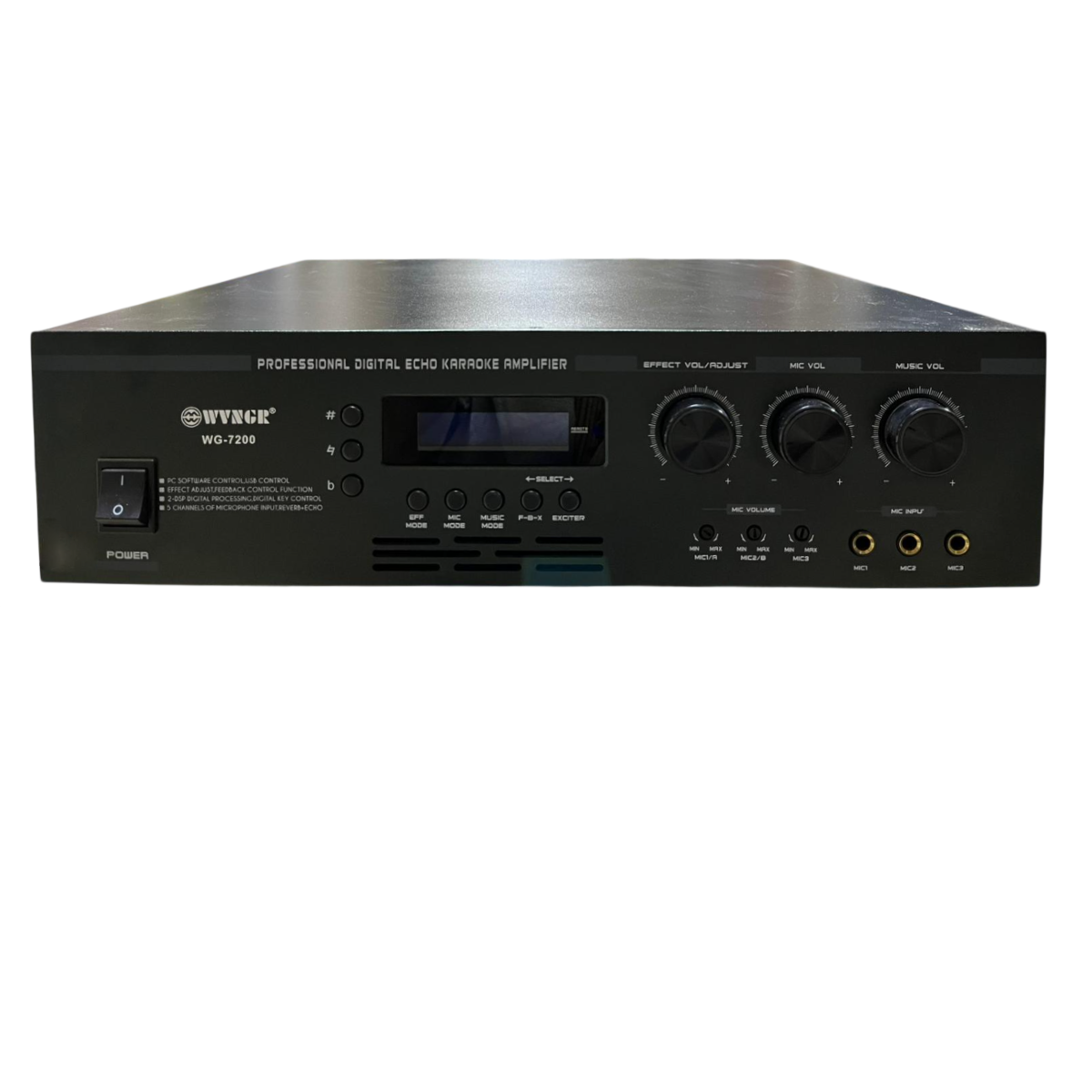 مضخم صوت احترافي من نوع Wvngr WG-7200 مخصص لأنظمة الكاريوكي، مزود بمعالج صدى رقمي (Digital Echo) يمنح الصوت طابعًا احترافيًا ويحسن جودة الغناء. يعمل بنظام ستيريو ثنائي القناة (2×250 واط)، مما يوفر توزيع صوت قوي ومتوازن، مناسب للاستخدام المنزلي والتجاري. يحتوي على تحكم مستقل في: مستوى صوت الميكروفون مستوى صوت الموسيقى تأثير الصدى (Echo) درجة الصوت (Tone) كما يدعم توصيل عدة ميكروفونات في نفس الوقت، مما يجعله مثاليًا للكاريوكي الجماعي. يُستخدم في: أنظمة الكاريوكي 🎤 المنازل المقاهي وصالات الترفيه الحفلات الصغيرة يتميز بسهولة الاستخدام وأداء مستقر مع جودة صوت واضحة ضمن فئته.